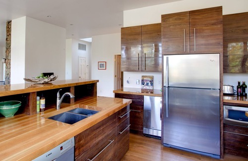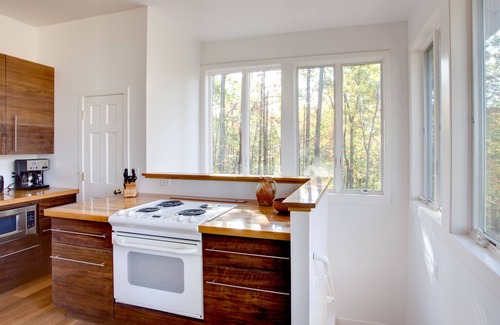 The Broadhead Mountain Retreat is located just a short drive from the city-limits of Charlottesville, taking you out of town, while still overlooking it. Broadhead, completed in 2011, offers modern living with rustic charm and quality. There are two private bedrooms to choose from –a master bedroom offering a high-end Savy Sleeper queen sized mattress and private bath and on the opposite side of the home a bedroom with two twin beds. If you feel like sleeping by a stone wood-burning fireplace claim the queen sized sleeper sofa in the living room. The open living room, with wide plank floors and wall of windows gives you a breathtaking view of the Piedmont Valley and Blue Ridge Mountains. The view alone is reason enough to stay here. The kitchen is both practical and aesthetically pleasing, fit for a chef, with stained wood countertops, stainless-steel refrigerator, dishwasher, stove and plenty of cabinet space. Whether you feel like eating at the kitchen table inside, or sitting outside, you’ll be taking in the essence of Mother Nature.