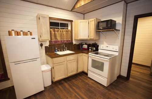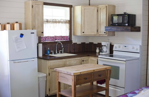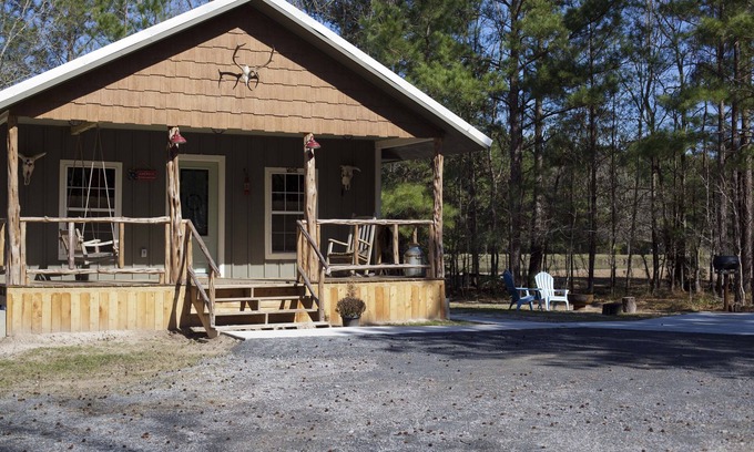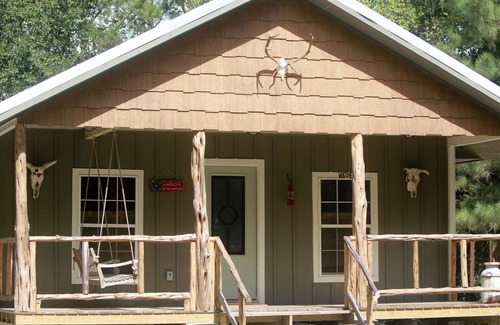This is a quiet, peaceful place literally at the "end of the road." We do have another rental next door that is separated by a privacy fence. Watch the cows eat or the wild geese land on the area ponds during their migration. The crickets and frogs are always musically inclined in the evenings for your listening entertainment. The cabin was designed with all sorts of repurposed items such as cross cut saws, a rub board, milk can, and even an old door turned into a headboard! Our favorite piece is a cedar chest salvaged from the flood of over a year ago that we picked up at a garage sale and sanded and refinished. It is beautiful! If you give us enough notice you might even end up eating a delicious cinnamon roll while you relax on the front porch swing. Y all come stay at our place. You will love it. Texas hospitality at its best.