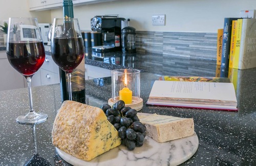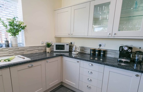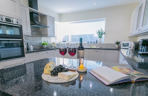 The kitchen is spacious and neatly to the point. A great space for chopping and chatting with a sociable breakfast bar for guests to hover and help.