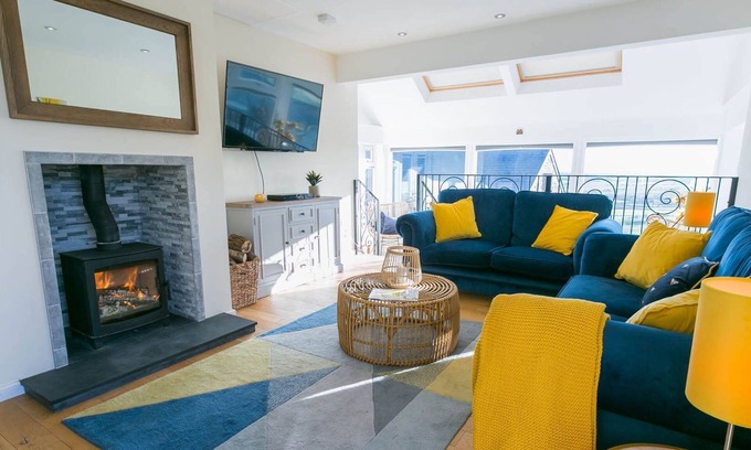 A cheery sitting room has comfy sofas, large smart TV and a cosy wood stove. A few steps lead down to a light filled space with plenty of places to flop and admire the view. A patio door leads out to a terrace with a second dining table for summer eating facing the wonderful green views across miles of the island over to Snowdonia.