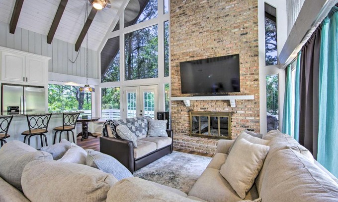 Offering a bar, Brookeland Resort Cabin with Golf and Lake Access offers accommodations in Brookeland. There's an outdoor pool and guests have access to free Wifi and parking on-site. The vacation home features 3 bedrooms, a fully equipped kitchen with a dishwasher and an oven, a washing machine, and 2 bathrooms with free toiletries. Towels and bed linen are featured in the vacation home. The accommodation has a fireplace.