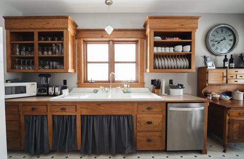 Perfect for home-cooked meals, you'll admire original details like vintage range and convenience of open shelves for easy meal prep.