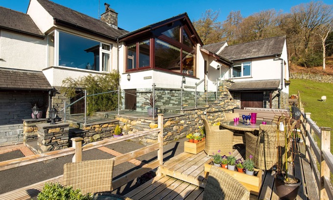 This quality single-storey cottage near Coniston overlooks Coniston Water and sleeps fourteen people in six bedrooms.