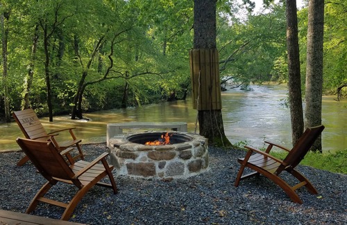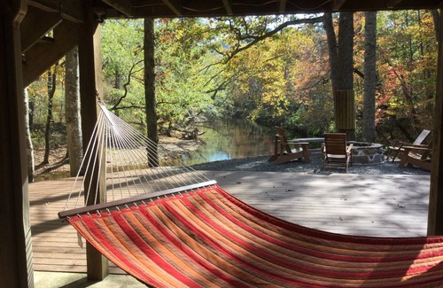 Master bedroom with bath, 2nd bedroom with queen size bed, 3rd bedroom with bunk beds (also have toddler bed if needed). Living room has 3 sleeper sofa's. The kitchen and living room have cathedral ceilings with skylights. The living room features a tv with satellite, stereo and dvd player. It has a wood burning fireplace and there are also games and movies for your convenience. The kitchen is full and completely functional with a large country table which seats 8 comfortably. Out the kitchen door, it opens up to a large screened in porch which overlooks the water. We love having our morning coffee there. There is also a cooler on the screened in porch for your use. Outside the screened in porch also has an open deck in which grilling is perfect. Under the house, there is a patio area in which you could eat, read, or relax in the hammock. There are corn hole boards and bags for a friendly game. Or take the canoes, kayak or tubes out for a float. Go fishing or swimming right on the property. At night enjoy the large firepit with a fire for smores or cook your meal of hot dogs on it. Please email owner for pet approval--50lbs or less plus we will need to know size and breed.