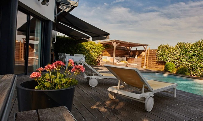 Recent house tastefully decorated, located in a dead calm, you will spend a very pleasant stay. Each room equipped with windows, provides access to a terrace with pool on the ground floor and a terrace of about 50 m2 upstairs. Each terrace is equipped with garden furniture. 2 rooms have their private bathroom, ideal for parents! The city center of Bordeaux is accessible by bus, tram or car. Depending on the chosen means of transportation, the trip will be from 15 minutes to half hour.