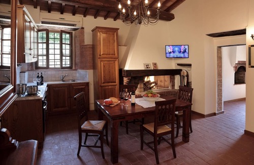 Furnished in typical rustic style with both couples are ideal antique and valuable furniture for families or friends who are looking for conviviality and privacy at the same time. Here it is still preserved the stone on which the mill was constructed the entire village and its beautiful wineries, expanded recently with the most accurate and prestigious modernization techniques. A terrace offers the ideal place to relax and eat outside, in total privacy and away from the traffic, with rare beauty. The stone walls, terracotta floors, ceilings with wooden beams, the air conditioning in each apartment, Wi-Fi and fully equipped kitchens, combine the taste and the warm Tuscan atmosphere of total comfort. Excursions by bike or on foot through the vineyards of the 'Brunello' will give you a unique and unforgettable stay.