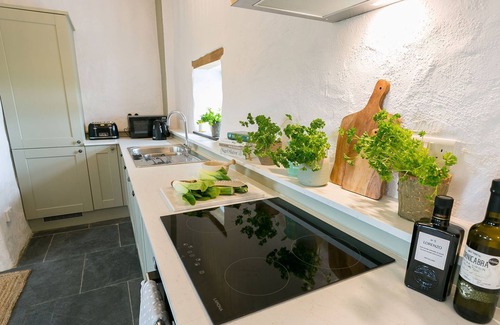 Kitchen/Dining and seating area - Open plan kitchen/dining/living area. The kitchen area has an electric hob and oven, microwave, cafetiere, fridge/freezer (3 drawers), dishwasher and washing machine. Dining table for two. Living area with comfortable sofa, wood-burning stove, Smart TV. Additional sun room with table and chairs.