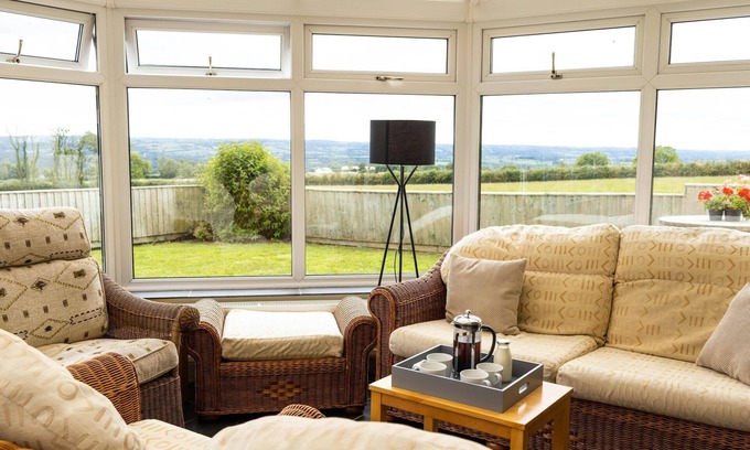 Conservatory: 2-seater, 3-seater, 2 chairs, table seating 13 people. Panoramic countryside views with doors leading to the garden