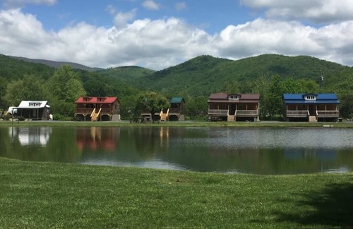 Our property sits along 1600 ft of the North Toe River (stocked with Trout) and is 10 miles off the Blue Ridge Parkway in Western North Carolina. Tiny Home Cabin #5 can comfortably sleep up to 8 people and features a queen bed on the main floor and has 2 sleeping lofts, each one with a queen memory gel foam bed. The cabin also has a futon in the living room. The cabin has a cozy living room with a TV and has a full kitchen with a refrigerator, gas range, microwave, and coffee maker. The cabin has several windows that look directly out to our fishing pond and allow great mountain breezes (aided by a ceiling fan) as well as panoramic Mountain views. The cabin also has an AC for the warmer summer days as well as a propane furnace that keeps the cabin plenty warm during the Fall or Winter nights. The cabin has a covered porch that looks directly at our pond and Buck Hill Mountain. Enjoy s'mores by your fire pit any time of the year! Or grill out using our communal park style charcoal grills by our pond. You bring your own pillows, linens/blankets, and towels for the bathroom, your fishing poles, and your hiking shoes (the campground is 144 acres and we have a hiking trail to the top of Buck Hill Mountain, approximately a 60 minute hike for most people) The campground also has a laundry facility, arcade room (recently renovated with billiards, 4 pinball machines, air hockey, and arcade games) and a dedicated fiber service that provides free high speed internet all over the campground! We also added a basketball court and pickleball courts for our guests to enjoy! Snow lovers we are only 12 miles from tubing at Jonas Ridge and 22 miles from Skiing at Sugar Mountain!