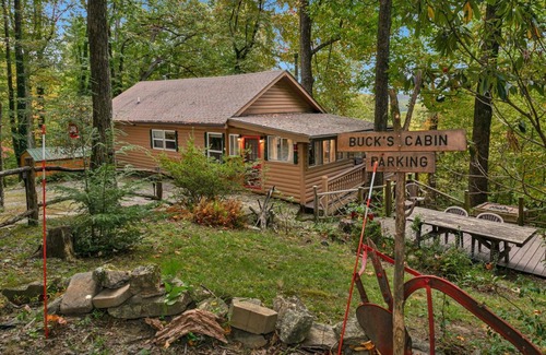Welcome to Buck’s Cabin. The cabin has the feel of a hunting lodge, while offering amenities such as central heat and air conditioning.Max guest 4. There is a queen bedroom on the main floor. The loft has a king bed. Two bathrooms are on the main floor, one with a corner shower and one with a tub. A private outdoor shower is also located on the back of the house overlooking two acres of hardwood forest. The outdoor shower is available when there is no threat of freezing temperatures. No pet fee for one well behaved housebroken dog less than 25 lbs. WIFI is provided free of charge, and a smart tv featuring all streaming services to sign on using your accounts. Also all local Fox, ABC, CBS, NBC, etc are available through an HD antenna. Fully equipped kitchen and a propane grill on the deck if you want to cook your own meals. Beautiful wood burning stove with wood provided. Screened porch, deck with dog gates, outdoor fire pit / deck and picnic area. Please see the photos! Parking for one vehicle.