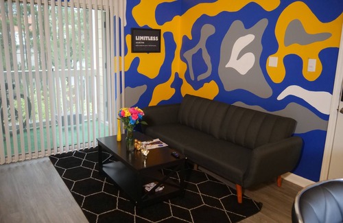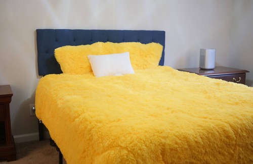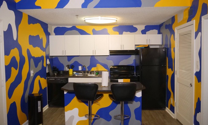 This space is perfect for podcasts, photoshoots, interviews, and commercials. There is a couch, coffee table, and 2 bars stools at the island in the common area. The walls are painted with a blue, yellow, silver, and white camo design grabbing your attention upon entry. The bedroom bed is layered with a feathery yellow comforter set, with a blue headboard.