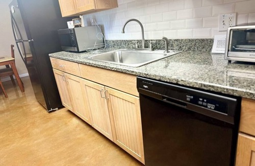 Fully equipped kitchen, long granite bar, and dining area with dishes, utensils,
