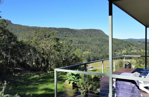 Nestled on the side of a hill amongst five acres of native garden and rainforest, Budderoo will take your breath away upon arrival. The uniquely designed building provides 270-degree views from its elongated all-glass living/dining/kitchen area looking out to the surrounding mountains and escarpments. A northeasterly deck makes the most of the sun and the direct view to Budderoo Escarpment whilst the covered south facing deck with additional lounge and dining is the ultimate shaded escape in summer. Whether you are watching the mist and cloud roll up through the valley to unveil the view or you are marvelling at the muted pink sunset tones reflecting off the escarpments, you cannot help but be captivated by this ever changing but ever present view.
