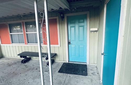 The entrance is on the back of the house, so you must come in through the private parking in the back to access the door. Please pull in to the street(Alley) behind the house. You will see sunflowers painted on the fence to guide up where to pull in. The parking space is lined with gravel and specifically for your unit only. Park in the spaces on the left side of the alley once you turn in. If necessary, you may also park on the street in front of the house and walk back around. Message me if you have any questions .