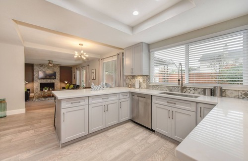 A spacious home and lovely grounds in a community that's fun and convenient to shopping, entertainment, and fine dining. The spacious home futures: - Custom wood floors throughout the house, Contemporary gourmet kitchen, fully stocked and set-up with stainless steel appliances, quartz counter tops, custom tile backsplash and a breakfast bar area and dining area, Open concept floor plan Living area with leather sofas and a 55" SMART TV. Open concept Family room area with leather sofas and a 50" SMART TV. Fabulous back yard with covered dining area, barbecue and a hammock. Laundry area in the garage with Washer and Drier, Attached Garage for 2 cars with a private driveway