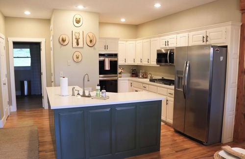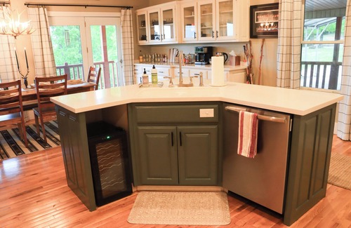 Welcome to The Butler Cabin! The main level features an open-concept living area, a well-equipped kitchen, a dining space, and a laundry area. The primary bedroom on this level includes a luxurious king-size bed for your comfort.