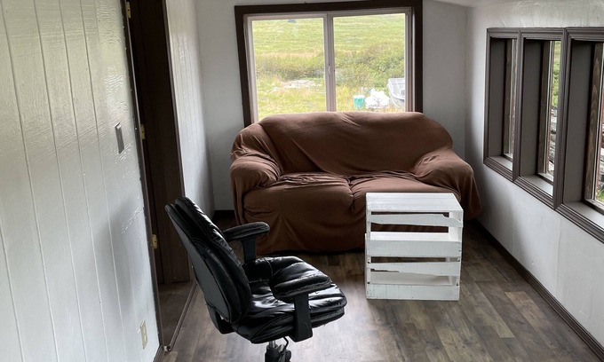 The Buffalo Room is located on the second floor of a duplex at the end of a cul de sac in a quiet neighborhood. The unit overlooks a field of tundra and boasts ocean and mountain views. This studio space is fully furnished with 2 full sized beds and a full kitchen. It also includes and adjacent sitting room with a love seat which can be swapped for a bed. The second floor deck is great for getting fresh air and getting a better look at the view.
