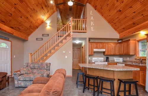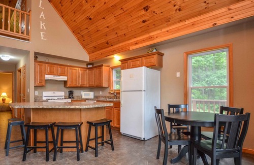 At Bufflehead Bungalow, you'll find an array of amenities designed to make your stay comfortable and enjoyable. The fully stocked kitchen is perfect for meal prep, while the large island with breakfast bar fosters social interactions among family and friends. Your group can relax in the inviting living area, complete with comfortable sofas, or step outside to the expansive wrap-around deck that allows for breathtaking views of the lush surroundings. The property features two queen bedrooms and a loft area, accommodating all your loved ones. Enjoy the private lakefront with 100 feet of natural lake frontage, perfect for kayaking or sunbathing, and watch the stars twinkle by the fire pit after a lovely evening.