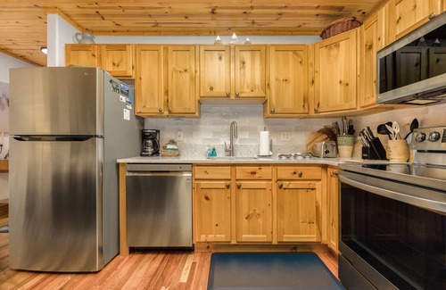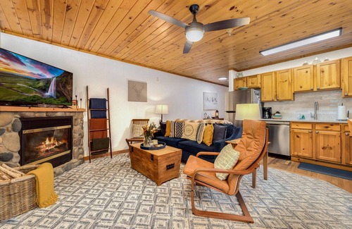 This NEWLY REMODELED and beautifully UPDATED 1-bedroom condo features a King bed and a bathroom with a jacuzzi tub/shower combo. The living room features a sofa sleeper along with a cozy, gas fireplace. The full-sized kitchen comes completely equipped with all your cooking needs and dining area. This condo has its own washer/dryer. Your private patio includes a NEW HOTTUB, GRILL, and patio furniture! Relax and watch the wildlife while overlooking the cliffs and the Fall River! Condo includes WIFI, Smart TVs, and complimentary fishing gear.