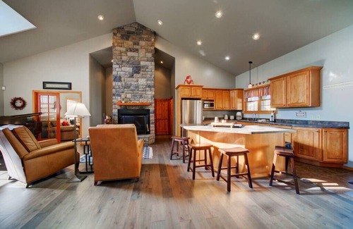 A hallway from the bedrooms leads to the open-concept living and dining room area. The living area includes high, vaulted ceilings, stacked-stone wood burning fireplace, kitchen, dining and living room. One corner of the living features a large flatscreen tv and an expansive corner sofa, while another corner offers a baby grand piano. The full kitchen is the dream of any home chef, with stainless steel appliances, a gas stove and plenty of counter space to work. The handsome dining table can serve up to eight guest with extra sitting at the counter as well. The dining area opens to a large private back patio with gas grill, dining tables and lounge areas.
