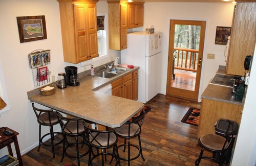 The Bullet Hole Cabin II was originally an Amish homesteader's cabin. Completely renovated and remodeled, it now offers comfortable sleeping for 6. Cozy at 840 square feet, the cabin also boasts 320 additional square feet of outside covered porches. The back porch also has a picnic table and gas grill for your bar-b-que enjoyment. Add a living room with a gas fireplace, a fully-equipped kitchen with custom oak cabinets and all the amenities, including a refrigerator, stove, microwave and dishwasher, all cookware and serving wear provided, a washer & dryer, 2 full bathrooms (one with an extra long tub), one private bedroom downstairs (queen bed), one private bedroom upstairs (full bed), and a loft bedroom (2 twins that convert to a king-size bed), and you will have memories of a lifetime waiting for you.