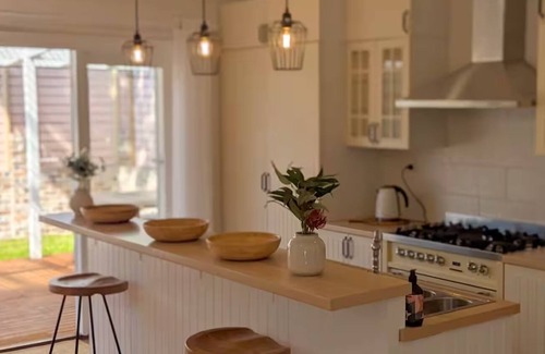 You'll love our cute and cosy cottage, tucked into a leafy lot with a small creek running along one side of the property filled with native birds. The house has been tastefully decorated with comfort and style in mind. It's within walking distance to trendy cafes, pubs, shops, bottle shop, Woolworths and a train station (5 min walk) and only 1 min drive or 20 min walk to stunning beaches including a fantastic off-lead dog beach (Macauleys).