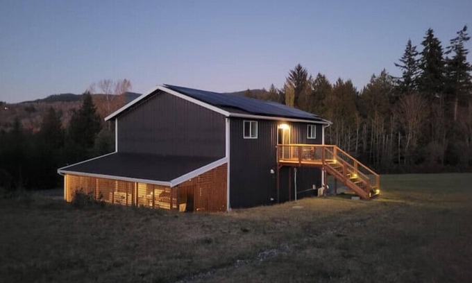 This guest suite is located on the 2nd floor of a standalone building approximately 125 ft. from our residence. Our property is located on 5 acres with family next door who own the adjacent 6.5 acres. The building sits in a open grass field close to the forest. A small creek runs through the forest at the bottom of the ravine. There is complementary EV charging inside the garage portion of the building.