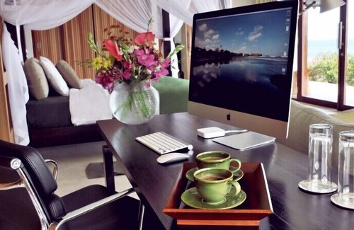 On the other side of the bedroom, you can find a home office. It actually is a very well-appointed place that you can use to think, write or work: a computer, wi-fi, plugs, a desk, a sofa, a TV and an espresso machine. This home office has a view on the beach, to kickstart your creativity.