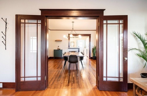 Just off the kitchen, our formal dining room radiates turn-of-the-century elegance. Feel transported among original picture windows, a spacious built-in bench and French doors that lead to the living room. You can eat breakfast at the two-seater bar which overlooks the kitchen. Or sit down for dinner around the live edge wood table (it seats 8 people) while recounting the day’s adventures. At night, get out bingo, cards or Trivial Pursuit for game night beneath the glass globe chandelier.