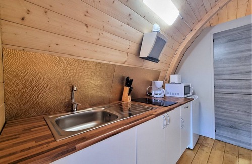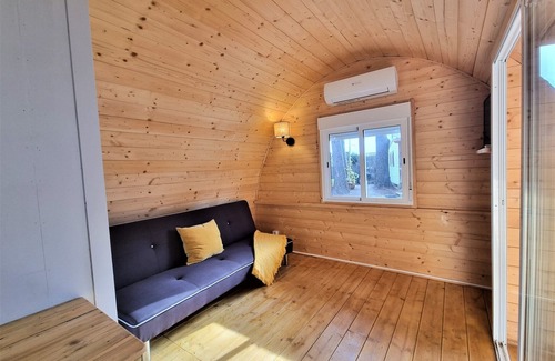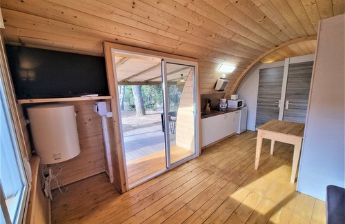 A cozy, pet-friendly bungalow perfect for couples or small families, this holiday home accommodates up to four guests with one double bedroom, a single sofa bed, and an extra bed in the dining area. Set within a peaceful camping resort, the space features air conditioning, a TV, and a private terrace with garden furniture for outdoor relaxation. Pets are welcome for a small nightly fee, and parking is conveniently available on the same plot. Guests may request additional amenities such as baby cots, high chairs, or pool towels at an extra charge. Nestled just 100 meters from Riells Beach, the bungalow offers an excellent location for seaside enjoyment. It's surrounded by souvenir shops, local bars, and a variety of restaurants, making it easy to enjoy the vibrant local culture. Set within Camping Lacus, the area includes a natural lake where guests can stroll, fish, or unwind in nature. Onsite activities are offered for families, making it an ideal destination for both relaxation and recreation. The open-plan kitchen comes equipped with a ceramic hob, fridge, toaster, kettle, coffee machine, and microwave—suitable for preparing simple meals. A private bathroom with a shower and hairdryer adds comfort, while cleaning and bed linen are included in the final cleaning fee. Towels and other extras can be rented, and a clothesline is available for convenience during longer stays. [Note: The communal swimming pool is available exclusively during July and August.]
