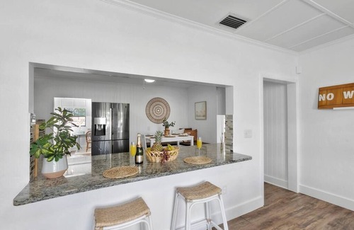This luxurious Bungalow offers 4 fully furnished bedrooms with a variety of bed sizes including, 1 king master suite, 2 queen beds, 2 twin beds and 2 full bathrooms. This home has been designed to accommodate friends & family looking for a cheerful getaway near the heart of Palm Beach! The house has been newly renovated from head to toe with a beautiful coastal vibe! Dressers, mirror, nightstands, lamps and cozy bathrobes in every room. Upon arriving you’ll notice an abundance of closets and storage space for all your personal belongings.