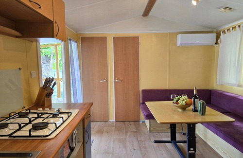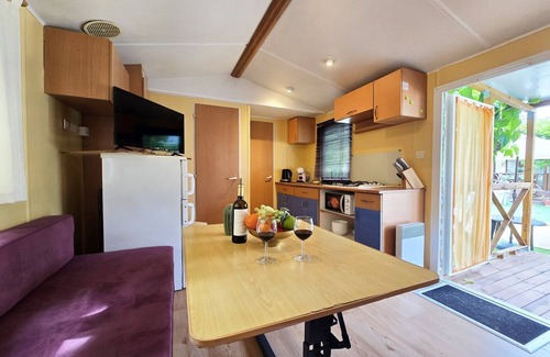 This beautiful, cozy bungalow nestled in a serene camping environment offers a restful stay ideal for families or small groups. It features two bedrooms—one with a double bed and another with two single beds—comfortably accommodating up to four guests. The living room includes a sofa, a dining table for four, and an air conditioner, creating a relaxing space for indoor leisure. The property is pet-friendly, welcoming non-dangerous breeds at no extra charge. Additionally, free on-site parking is available, and the holiday home allows access to campsite amenities including a swimming pool and other seasonal activities at no additional cost. Ideally located in Canet de Mar’s urban area, this holiday home places you within steps of the scenic Canet de Mar beach. Nearby, you’ll find several local bars and restaurants offering regional cuisine. Art and architecture enthusiasts can visit the Museum of Lluís Domènech i Montaner, a cultural highlight of the area. The property sits on the Pedracastell hill in the Maresme region, providing stunning views and easy access to nature trails. A commuter train station within the town offers convenient connections to nearby cities, while bus routes and regional transport services enhance overall accessibility. The bungalow includes a fully equipped kitchen with a gas stove, refrigerator with freezer, microwave, Dolce Gusto coffee maker, toaster, and kettle—perfect for preparing home-style meals. Guests are provided with essential kitchenware and utensils. The bathroom includes a shower and a separate toilet, ensuring privacy and functionality. [Note: The communal swimming pool is available exclusively during July and August.]