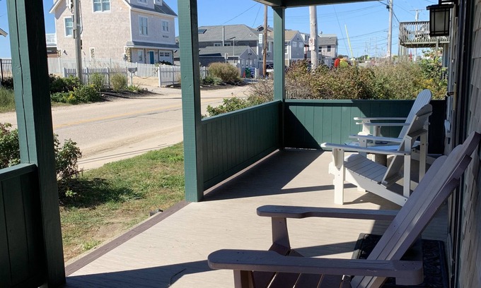 The house has a living room with dining area, full kitchen and large bathroom with full sized tub/shower combo. Both bedrooms are located upstairs, each with a twin and queen bed. The living space of the house also includes two covered porches. The porchon the back of thehouse provides additional dining set up and grill while the front porch provides comfortable seating, ocean breezes and the perfect place to sit back and take in all that Matunuck has to offer.