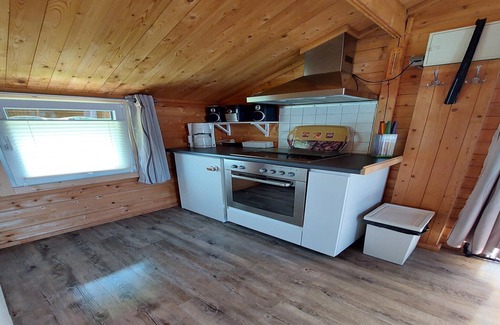 Layout: Ground floor: (open kitchen(electric kettle, toaster, cooker(4 ring stoves, ceramic), coffee machine, oven), Living/bed room(double bed, TV(flatscreen), seating area), bathroom(shower, washbasin, toilet), mezzanine(via fairly steep stairs)(double bed box), storage)