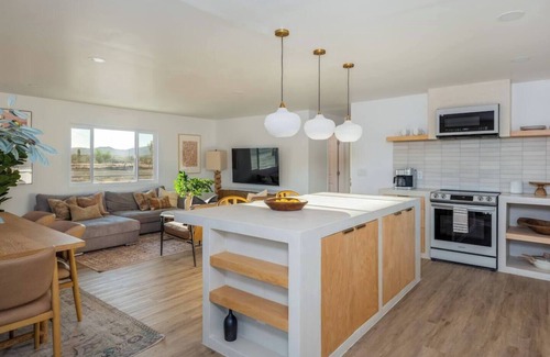Opportunity to enjoy the Moonstone Bungalow with a smaller group! Nestled amidst the stunning Mojave landscape, our casita (1100 SF) offers 2 bedrooms and 1 bathroom + pool bathroom. This property has two king beds, and sleeps 4 guests comfortably to enjoy a wealth of amenities for relaxation to ensure an unforgettable getaway.