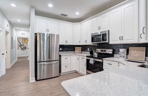 This freestanding duplex boasts two fully equipped kitchens and four bathrooms, ensuring convenience and comfort for everyone in your party. Picture yourself dining on the second-floor balcony under the stars, creating magical memories before you say "I do." Additionally, with four smart TVs connected to Netflix, Amazon Prime, and Roku, you can unwind and enjoy your favorite shows together after the day's festivities. Free parking is also available, allowing for hassle-free access for all your guests.