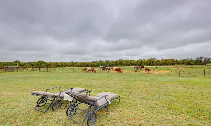 This 1-bath vacation rental studio on Copperas Creek Ranch in Sidney is the perfect base for a peaceful retreat in the Lone Star State. Start each day with coffee and expansive pasture views — you may be greeted by one of the Texas Longhorns! Seeking adventure? Head to Brownwood for dining, shopping, and fun on the lake! Then, fire up the shared grill for a BBQ before the stars come out.