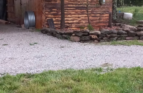 The bunkhouse has a glass front wood stove with wood, air-conditioning, a small refrigerator(all bottled water provided), Large water/tea kettle, a 5 in-one Toaster oven/air fryer, a coffee maker (coffee provided), an induction Hotplate, a Crockpot, a Full set of dishes for 2, an electric heater anda memoryfoam futon couch when it iscombined with the bottom drop-down bunk shelf than they are a little bigger than a queen.The top shelf is 72"L, 24"W with a 225lb limit, Restrooms are 125' away. Check-in is at 2:00 p.m. and Check-out is at 10:00 am. Sorry, NO BEDDING items are provided except pillows. Sorry, we prefer no pets, but for a $20 one-time fee per pet. Try Our new swimming hole now open.
