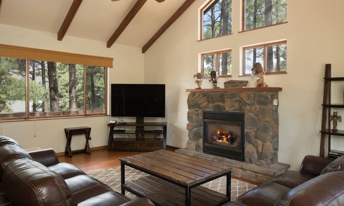 Burning Tree Lodge - Forest Views, Fire Pit, AC | Pet and Family Friendly is located in Flagstaff. Burning Tree Lodge - Forest Views, Fire Pit, AC | Pet and Family Friendly provides accommodation, featuring Air Conditioner, Parking, TV, among other amenities. This Cabin features Air Conditioner, Parking, TV, to make your stay a comfortable one.