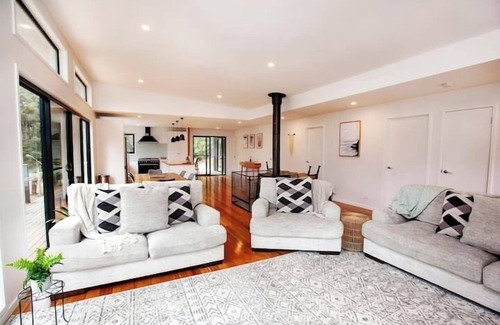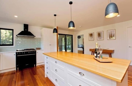 This modern, luxury home offers absolute seclusion for couples seeking a romantic getaway or a group of up to 9 people. Walk to the beach within minutes, or listen to the ocean's song in your cosy bed at night! You may catch a glimpse of the elusive white wallaby here, along with abundant bird life. Extra luxuries include complimentary wine on arrival, heated floors in the main bathroom and a quality coffee machine. The beautiful outdoor seating spaces provide options for intimate gatherings.