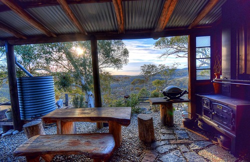 The stunning studio is a private fully self contained hut, exquisitely hand built out of bush rock and mountain ash, situated high on a ridge above the "Snowy" looking out at exclusive, absolute panoramic views.