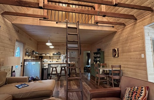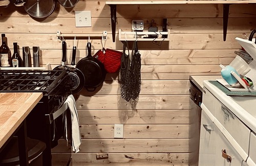 The main living space consists of a fully stocked open kitchen, a wood stove, multiple storage cabinets, as well as a super cozy seating area to lounge after a day frolicking in the mountains. A library ladder can be used to access the large loft bedroom. There is a single bathroom with a shower and washer/dryer. The entryway is spacious and there's plenty of room for hanging coats and leaving shoes.