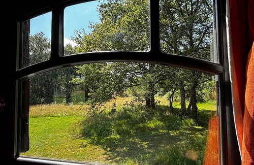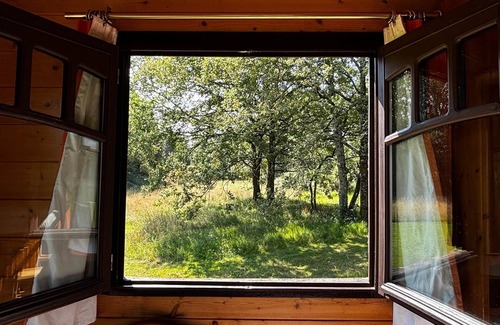 The Roulotte Bouton d'Or bohemian spirit, true invitation to travel and symbol of a new lifestyle is installed facing the forest and offers a breathtaking view of the park. It is particularly sunny. Its wooden interior and decoration in the orange colors will seduce you.