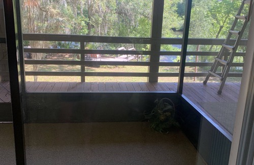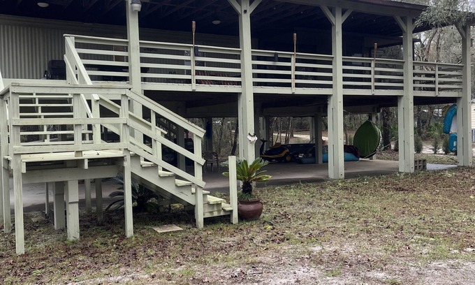 Experience a serene waterfront getaway at our Suwannee River home, complete with a private dock perfect for fishing, boating, and water activities. Take a leisurely stroll through nature or lounge on the huge deck that offers breathtaking views of the water. Gather around the cozy fire pit with family and friends for a memorable evening under the stars. The home is conveniently located on an asphalt road, so you won't have to worry about navigating through dirt roads. Additionally, you can park your vehicle under the raised house and porch, which can accommodate vehicles up to 7' high. Inside, you'll find a clean and comfortable interior with two bedrooms and a futon in the living room that can comfortably sleep up to six guests. The home is also in close proximity to several towns that offer grocery and dining options. And if you're up for exploring the area by boat, a boat ramp is just a quarter-mile away. With easy access to all the springs in the area, whether by boat or car, this waterfront retreat is the perfect spot for a relaxing vacation.