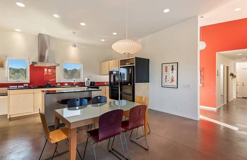 The house is 1700 square feet of mid-century modern interiors, with a split design, and each of the two bedrooms has a full en suite bathroom. Each bedroom has a queen-sized bed, night tables, reading lights, ceiling fan, and views of aspen, pinon, and juniper trees. The media room and master bedroom both have flat-screen TV's. The kitchen shines with black granite countertops, an island with bar stools, and top-of-the-line appliances. Relaxing in the living room means gazing at the Sangre de Cristo mountains. The patio, which features a table and chairs, two chaise lounges, and a gas grill, is accessible from both the living area and the master suite, and looks northeast, directly at the gorgeous Sangre de Cristo Mountains and the peaks of the Colorado Rockies. The patio is covered in the warm-weather months to protect from the strong sun. Other features include air conditioning, high ceilings, a wood-burning fireplace and an over-sized shower with a bench in the master bath. Expansive windows throughout the house allow you to enjoy the breathtaking view from multiple room, and the multi-colored sky at sunrise and sunset. The home is deliberately oriented and constructed to assure optimal natural heating and cooling, and has state of the art high powered ceiling fans in every room to provide comfort year round.