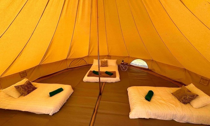 Beautiful Bell Tent, situated in a 4 acre meadow next to woodland with country views, complete with indoor wood-fired stove, webber BBQ, firepit, and hamock. With a outdoor shared flusing toilet and hot shower. Hot Tub area is bookable only between 11am till 4pm each day. Solar panels provide lighting and phone charging. Just a 8 minute walk to the Village Chackmore, 20 minutes to stowe gardens, and 30 minutes to Buckingham.