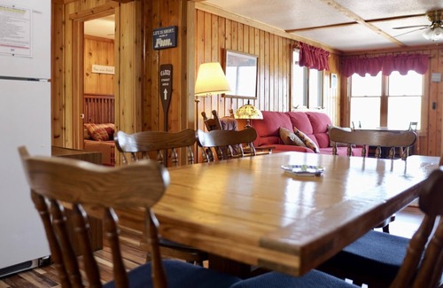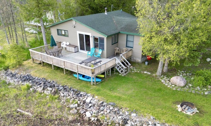 The interior of the cottage is finished in knotty pine, giving it a warm Up North feel. The home's deck is just a couple steps from the water's edge, offering an expansive view of Potagannissing Bay where you can watch both boats and ducks pass by.