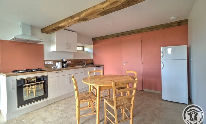 Gîte located 2 km from the lovely village of Villecheneve in the Monts du Lyonnais area, in hamlet consisting of a few houses including that of the owner and his farm shed. It is set in a former family farm building typical of the region (totally renovated in 2022), below a small country road. This large house also includes a 2nd gîte for 6 people. Every accommodation has separate entry and grounds. The 2 gîtes can be groupped to provide accommodation for 12 people (internal connecting door). The gîte 'Côté Jardin' has spacious and confortable interior, tastefully renovated. On the ground floor (1 step for access from terrace) : kitchen. laundry room/boiler room (accessed via 2 stairs), open living room (accessed via 2 other stairs, dining area, lounge area with sofa/coffee table). Hall. 2 bedrooms (1 bedroom with double bed, 1 family room with double bed & bunk beds), shower room, separate Wc. Outdoors : private enclosed garden to front, gravelled terrace, garden furniture, deck chairs, parking area. Beautiful views of the surrounding countyside and further the Monts du Forez. Many walks possible from the gîte. Medieval leisure park 13 km away.