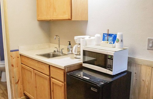 1 Queen Bed-Chair-Dresser-Closet-1 Bathroom with Shower-Kitchenette with Microwave, Coffee Pot, Sink, Counters and Cabinets. Thunderbird