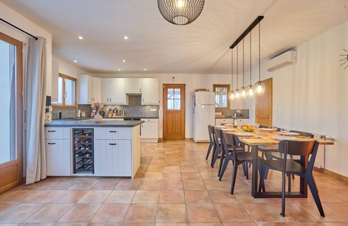 The Cocoonr/Book&Pay agency offers this charming 130 m² house with private swimming pool for rent in Saint-Astier, France, which can accommodate up to 8 travelers. It features a lovely 60 m² living room (with fireplace), a fully-equipped kitchen, four bedrooms, two bathrooms and a 3,400 m² garden. Wifi (fiber optics), bed linen and towels included, we're waiting for you!